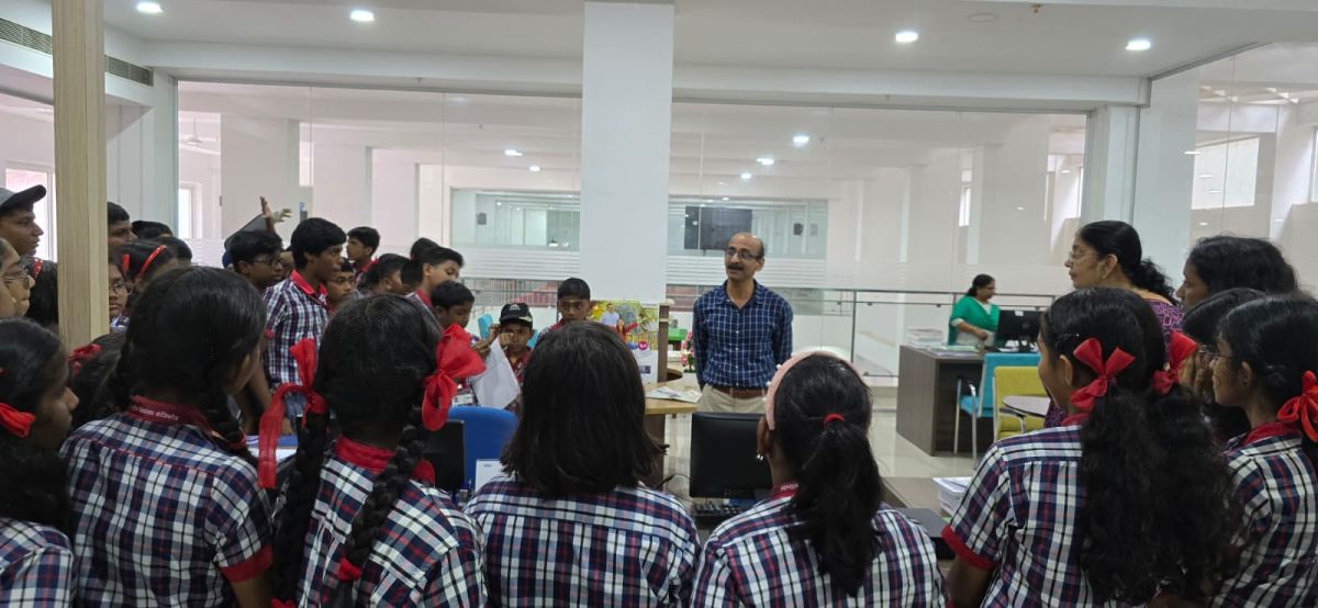 Dr. Francis gave an insightful explanation of RFID technology and demonstrated how it works at the library entrance. He also emphasized the importance of libraries, the benefits of cultivating a reading habit, and the value of science and literature. He spoke about identifying fake news and encouraged students to read critically. The students engaged enthusiastically, asking questions and actively participating in the discussion. Many students won prizes for answering questions during the interaction.